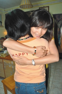 大陸女子黃湘君(右)熱情地?fù)肀ПM心幫助她們的林南慧,感謝他們這段時(shí)間的幫忙。