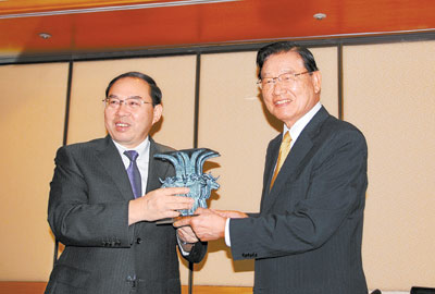 8日中午,;鶗(huì)董事長江丙坤在臺(tái)北會(huì)見了率團(tuán)正在參加“2010年臺(tái)灣湖南周”活動(dòng)的中共湖南省委副書記梅克保一行。