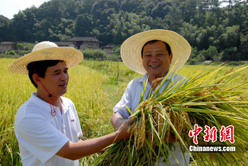 8月11日,臺(tái)灣客商劉佑麟(右)與福建省永定縣農(nóng)業(yè)專家望著沉甸甸的臺(tái)灣“仙光米”稻谷露出了開心的笑容。(劉永良 攝)