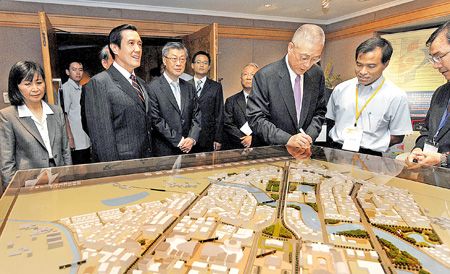 馬英九與吳敦義(右三)及“經(jīng)建會(huì)”主委劉憶如(左一)參觀桃園航空城等招商案。圖片來源:臺(tái)灣《中國(guó)時(shí)報(bào)》