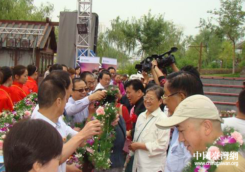 甘肅省各級(jí)領(lǐng)導(dǎo)為甘肅首批赴臺(tái)游客佩戴花籃 (圖片來(lái)源:甘肅省臺(tái)辦)