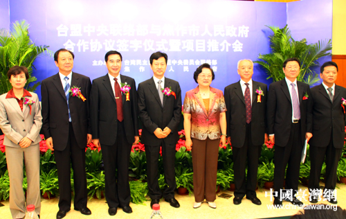 臺(tái)盟中央主席林文漪(右四)、臺(tái)盟中央副主席黃志賢(左三)、河南省副省長(zhǎng)宋璇濤(左四)等出席臺(tái)盟中央聯(lián)絡(luò)部與焦作市簽署合作協(xié)議儀式。(中國(guó)臺(tái)灣網(wǎng) 孫金誠(chéng) 攝)