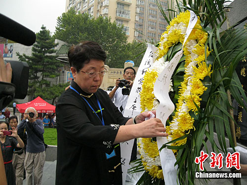 圖為臺灣新黨原主席謝啟大女士為抗日烈士敬獻花圈。中新社發(fā) 劉柱 攝