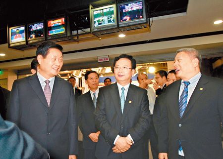 陜西省代省長趙正永(左)、副省長景俊海(中)一行人15日在臺灣旺旺中時媒體集團(tuán)董事長蔡衍明(右)等人陪同下參觀中天電視!碓矗号_灣《中國時報》