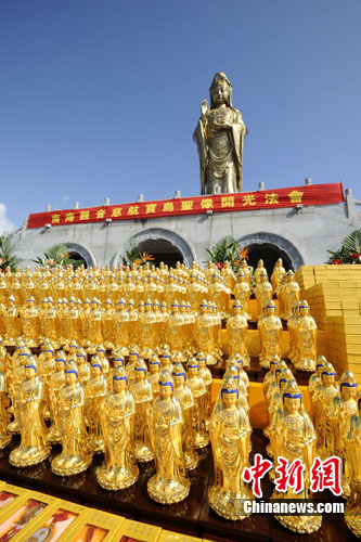 9月17日,“海天佛國”普陀山的108位高僧大德要護(hù)送1000尊觀音寶像去臺(tái)灣。來自臺(tái)灣寶島的南海觀音文教基金會(huì)董事長吳天池格外開心,特意趕到普陀山協(xié)調(diào)這一兩岸佛界盛事。
