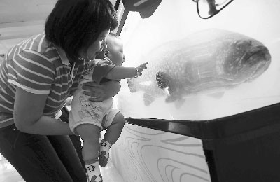 一個(gè)小孩試圖碰觸在水箱里的龍膽石斑魚