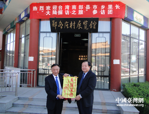 圖為鄭各莊村領(lǐng)導(dǎo)與參訪團(tuán)成員互贈(zèng)禮品。(中國(guó)臺(tái)灣網(wǎng) 王賽賽 攝)