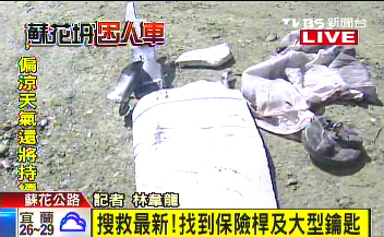 蘇花公路發(fā)現(xiàn)疑似失蹤大陸游客所乘游覽車前方保險桿、插著鑰匙的油箱蓋、小孩洋裝和防火板。 來源:臺灣TVBS電視臺