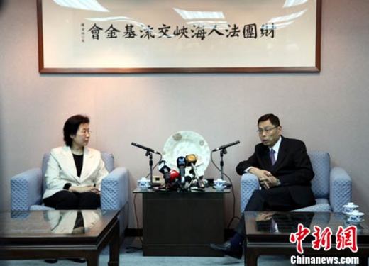10月27日,大陸海協(xié)會副秘書長張勝林等抵達臺灣,了解在臺灣蘇花公路失蹤的20名大陸同胞的搜救進展情況。圖為張勝林(左)下午會見;鶗倍麻L高孔廉。中新社記者 陳立宇 攝