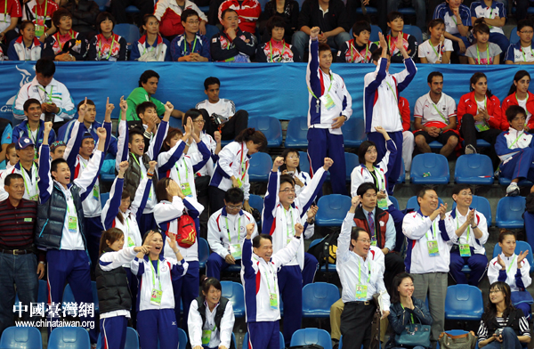 中華臺北跆拳道隊隊員、教練員為黃顯詠助威(中國臺灣網(wǎng) 鐘寶華 攝)