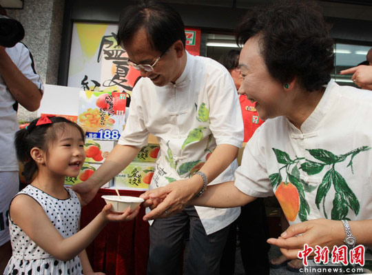 資料圖:6月18日下午,臺南縣縣長蘇煥智攜夫人身穿芒果裝,現(xiàn)身上海一家7-ELEVEn門店,促銷臺南縣特有的優(yōu)質(zhì)水果——愛文芒果。中新社發(fā) 潘索菲 攝