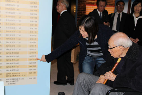 陳鳴錚定定地看著展板,情不自禁身體前傾,頭上白發(fā)微微顫動(dòng)。97歲的老人家,應(yīng)該看不清那些密密麻麻的文字,但他知道那是他熟悉的名字,因?yàn)樗约阂彩瞧渲兄弧?/P>