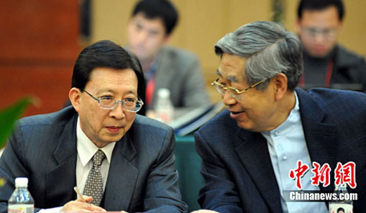 1月18日,第九屆兩岸關(guān)系研討會(huì)在廣西桂林開(kāi)幕。會(huì)上,中華文化發(fā)展促進(jìn)會(huì)會(huì)長(zhǎng)許嘉璐與臺(tái)灣中華文化總會(huì)會(huì)長(zhǎng)劉兆玄親切交流。中新社記者 蔣雪林 攝