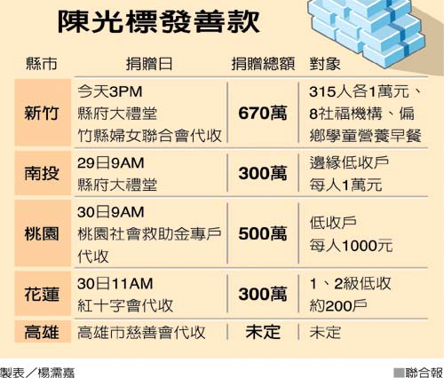 陳光標接著的行程,依序到南投、桃園、花蓮、高雄發(fā)善款。陳光標29日到南投縣政府大禮堂,發(fā)給300個低收邊緣戶,每人1萬元;桃園縣行程則為30日上午,陳光標捐助500萬元,由桃園縣社會救助金專戶代收;陳光標捐給花蓮300萬元,30日由紅十字會花蓮支會代收,捐贈對象為一、二級低收入戶。紅十字會花蓮友會表示,受贈者估計約200多戶。(中國臺灣網(wǎng) 馮存健)