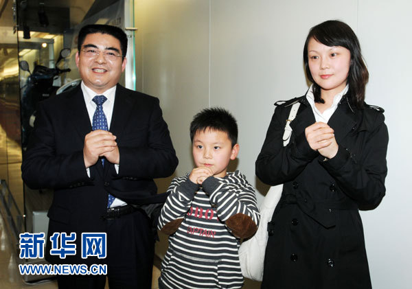 1月26日,陳光標(左)攜妻兒抵達臺灣桃園機場。當日,大陸著名慈善家陳光標抵達臺灣,與他同行的還有50多名大陸企業(yè)家。按計劃,他們于27日開始在臺灣9個縣市發(fā)放“感恩紅包”,每個紅包從1萬新臺幣到5萬新臺幣不等,價值總計約1.1億元人民幣。 新華社發(fā)