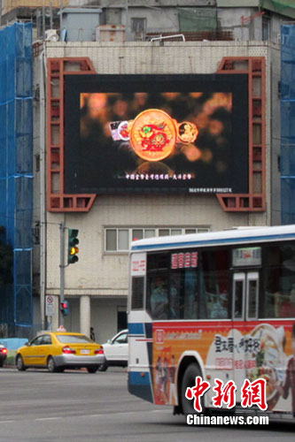 2011年辛卯兔年春節(jié)將至,圖為中國(guó)金幣總公司在臺(tái)灣的總經(jīng)銷臺(tái)灣大洋金幣公司在臺(tái)北市鬧市區(qū)“臺(tái)北博愛(ài)特區(qū)”大型電視屏幕上播放的中國(guó)人民銀行發(fā)行的2011辛卯兔年金銀紀(jì)念幣廣告。