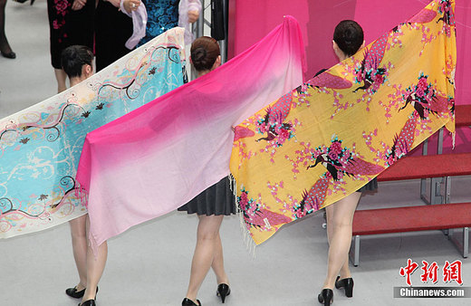 3月21日下午,由上海市婦女聯(lián)合會(huì)主辦的“花開臺(tái)北·海派女性風(fēng)采展”在臺(tái)北開幕,滬上112位杰出女性代表身著各式旗袍亮相花博會(huì)流行館,與相聚在此的臺(tái)灣婦女會(huì)總會(huì)姐妹們暢敘友情。圖為上海婦女代表團(tuán)成員現(xiàn)場表演絲巾秀。中新社發(fā) 符永康 攝