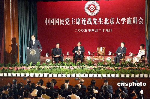 資料圖:二零零五年四月二十九日,中國國民黨主席連戰(zhàn)在北京大學發(fā)表演講,受到北大師生的熱烈歡迎。 中新社發(fā) 廖文靜 攝