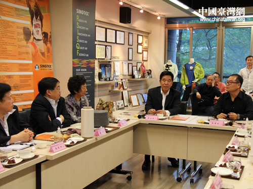 寧夏紡織產(chǎn)業(yè)考察團(tuán)在臺灣興采實(shí)業(yè)股份公司考察、座談(前排右一為興采實(shí)業(yè)股份公司總經(jīng)理陳國欽,右二為寧夏自治區(qū)政協(xié)副主席解孟林,左三為寧夏自治區(qū)黨委副秘書長、臺辦主任張秀燕)。圖片來源:寧夏臺辦