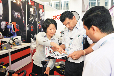 4月16日,一家生產(chǎn)專業(yè)電動(dòng)工具的臺(tái)企參展商(左)在第109屆廣交會(huì)上向采購(gòu)商介紹產(chǎn)品。 新華社記者 陳曄華 攝