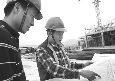 汪培昇(右)與技術(shù)人員在施工現(xiàn)場。