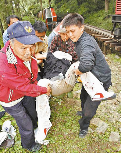 緊急救援,沒(méi)受傷的游客加入救人行列,幫忙抬傷者就醫(yī)。圖片來(lái)源:臺(tái)灣媒體