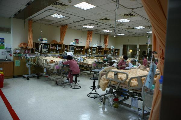 4月28日,工作人員在臺(tái)灣嘉義市圣馬爾定醫(yī)院的加護(hù)病房?jī)?nèi)忙碌。當(dāng)日,在阿里山火車事故中受傷的大多數(shù)乘客已出院,目前留在圣馬爾定醫(yī)院接受治療的還有16人,其中兩名重傷員仍在加護(hù)病房中接受治療。臺(tái)灣阿里山27日中午發(fā)生小火車翻車事故,截至當(dāng)天晚間11時(shí),事故已造成5名大陸游客罹難,百余名大陸游客不同程度受傷。 新華社記者龔兵攝