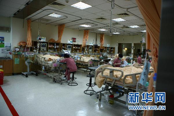 新華社照片,嘉義(臺灣),2011年4月28日 阿里山火車事故傷者繼續(xù)接受治療 4月28日,工作人員在臺灣嘉義市圣馬爾定醫(yī)院的加護病房內(nèi)忙碌。當日,在阿里山火車事故中受傷的大多數(shù)乘客已出院,目前留在圣馬爾定醫(yī)院接受治療的還有16人,其中兩名重傷員仍在加護病房中接受治療。臺灣阿里山27日中午發(fā)生小火車翻車事故,截至當天晚間11時,事故已造成5名大陸游客罹難,百余名大陸游客不同程度受傷。 新華社記者龔兵攝