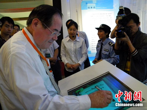 在參觀江陰成就館時(shí),看著描繪江陰城鎮(zhèn)新面貌的一幅幅照片,多次來過此地的臺(tái)灣鄉(xiāng)鎮(zhèn)市區(qū)長聯(lián)誼會(huì)主席李乾龍?jiān)陔娮雍灻燎,欣然題寫“幸福城市”。中新網(wǎng)發(fā) 唐娟 攝