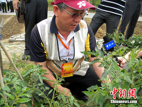 在江陰的農(nóng)田中,看著剛打花苞的西紅柿枝苗,新竹縣五峰鄉(xiāng)的鄉(xiāng)長葉賢民不自覺蹲在地頭,他一邊折去枝葉,一邊向“村長”介紹,“將花蕾周圍的突枝除去,結(jié)的西紅柿?xí)!敝行戮W(wǎng)發(fā) 唐娟 攝