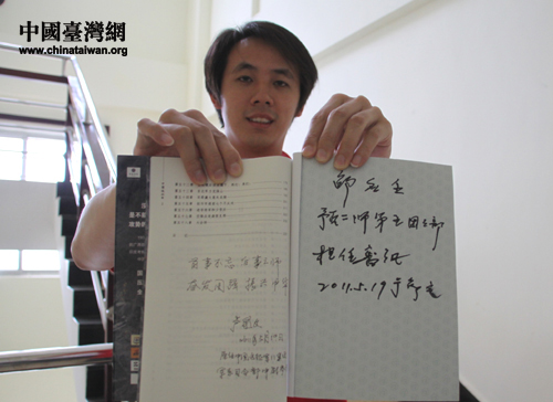 蔡秉憲展示盧彩文老兵和邵應(yīng)壬老兵的簽名。(中國(guó)臺(tái)灣網(wǎng) 楊永青 攝)