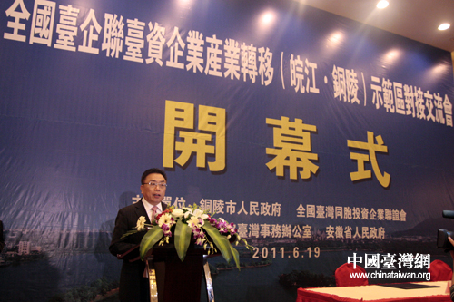 中國(guó)臺(tái)灣網(wǎng)6月19日銅陵消息 全國(guó)臺(tái)企聯(lián)臺(tái)資企業(yè)產(chǎn)業(yè)轉(zhuǎn)移(皖江·銅陵)示范區(qū)對(duì)接交流會(huì)開(kāi)幕式今天上午在安徽省銅陵市舉行。全國(guó)臺(tái)企聯(lián)會(huì)長(zhǎng)郭山輝、監(jiān)事長(zhǎng)丁鯤華、常務(wù)副會(huì)長(zhǎng)兼秘書(shū)長(zhǎng)何世忠等臺(tái)企聯(lián)主要代表,國(guó)臺(tái)辦交流局局長(zhǎng)程金中、經(jīng)濟(jì)局處長(zhǎng)于紅以及當(dāng)?shù)厥∈蓄I(lǐng)導(dǎo)出席開(kāi)幕式。