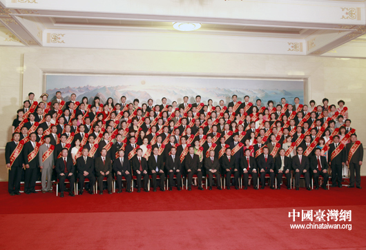 6月27日上午,對(duì)臺(tái)工作先進(jìn)集體、先進(jìn)個(gè)人表彰大會(huì)在北京人民大會(huì)堂舉行。圖為中共中央政治局常委、全國(guó)政協(xié)主席賈慶林見對(duì)臺(tái)工作先進(jìn)集體和先進(jìn)個(gè)人代表并合影留念。 (中國(guó)臺(tái)灣網(wǎng) 田云鵬 攝)