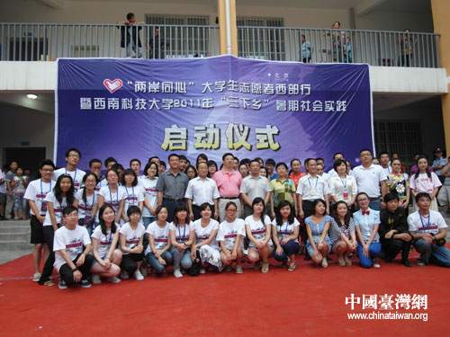 中國臺灣網(wǎng)7月12日綿陽消息 日前,由綿陽市臺辦、共青團(tuán)西南科技大學(xué)團(tuán)委、清華大學(xué)港澳臺事務(wù)辦公室、西南科技大學(xué)港澳臺事務(wù)辦公室、游仙區(qū)劉家鎮(zhèn)黨委政府共同主辦的第五屆“兩岸同心”大學(xué)生志愿者西部行暨西南科技大學(xué)2011年“三下鄉(xiāng)”暑期社會實踐活動在四川綿陽劉家鎮(zhèn)小學(xué)正式拉開帷幕。來自臺灣新竹清華大學(xué)、臺灣師范大學(xué)、臺灣大學(xué)、成功大學(xué)以及清華大學(xué)(北京)、中國美院和綿陽西南科技大學(xué)等40余名師生參加啟動儀式!