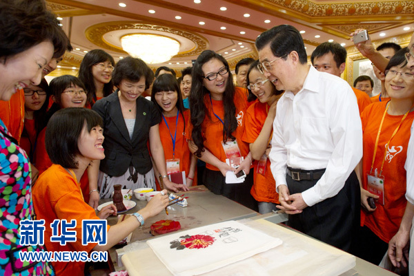 7月12日,中共中央總書記胡錦濤在北京人民大會堂參加兩岸萬名青年大交流主題聯(lián)歡活動。這是胡錦濤同正在嘗試用木版水印技藝復制國畫作品的臺灣青年親切交談。 新華社記者 李學仁 攝