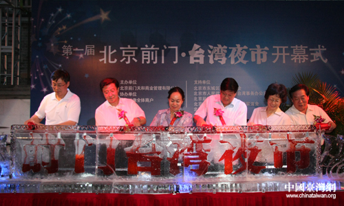 第一屆北京前門臺(tái)灣夜市昨日開幕,各界嘉賓為冰雕注入紅酒,寓意“紅紅火火”。(中國臺(tái)灣網(wǎng) 于斯文 攝)