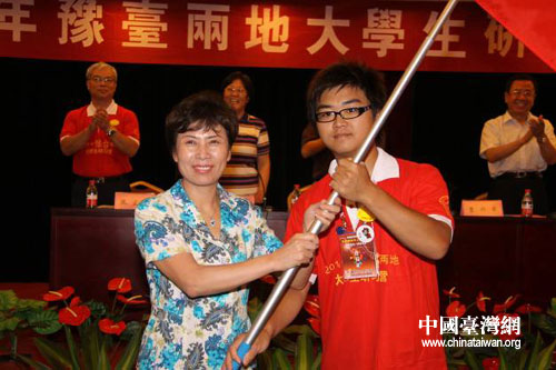 中國臺(tái)灣網(wǎng)7月15日鄭州消息 7月15日,由河南省臺(tái)辦、省臺(tái)聯(lián)主辦,以“走進(jìn)天地之中、探尋‘四大古都’”為主題的2011年豫臺(tái)兩地大學(xué)生研習(xí)營在鄭州舉行開營儀式。河南省臺(tái)辦主任宋麗萍宣布“2011年豫臺(tái)兩地大學(xué)生研習(xí)營正式開營”并向營員授營旗。來自臺(tái)灣長榮大學(xué)、嘉義大學(xué)和華北水利水電學(xué)院的師生百余人參加開營儀式。