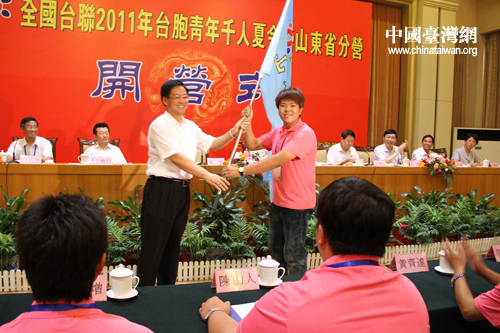 在開營式上,省委副書記、省政協(xié)主席劉偉向夏令營山東分營授了營旗。(圖片來源:山東省臺聯(lián))