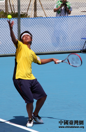 腰部傷勢嚴重,謝正鵬咬緊牙關(guān)發(fā)球。(中國臺灣網(wǎng) 王思羽 攝)