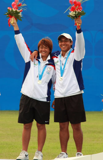 奪得大運(yùn)會(huì)反曲弓混合團(tuán)體賽銀牌的中華臺(tái)北選手袁叔琪(左)、田剛(右)。(中國臺(tái)灣網(wǎng) 于斯文 攝)