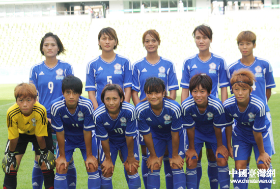 中華臺北女子足球隊深圳首戰(zhàn)先發(fā)11人合影。(中國臺灣網(wǎng) 王思羽 攝)