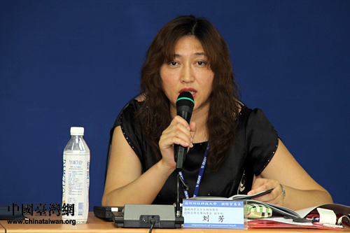 建行“e路通”杯首屆海峽兩岸大學生網絡商務創(chuàng)新應用大賽組委會副主任劉芳在研討會上介紹本屆大賽相關情況。(中國臺灣網 王偉 攝)