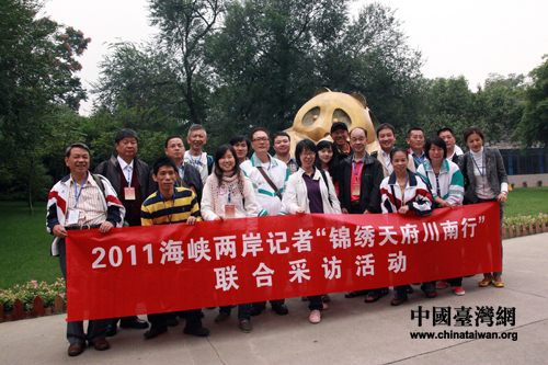 兩岸記者在成都大熊貓繁育研究基地合影留念。(中國臺灣網(wǎng) 馬迪 攝)