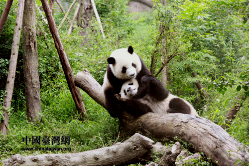 兩只活潑的幼年熊貓在親密嬉戲。(中國臺灣網(wǎng) 馬迪 攝)