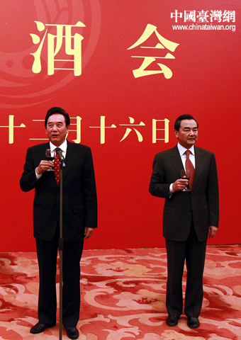 12月16日,紀(jì)念海峽兩岸關(guān)系協(xié)會(huì)成立20周年招待酒會(huì)在北京人民大會(huì)堂舉行。圖為海協(xié)會(huì)會(huì)長(zhǎng)陳云林(左)在招待酒會(huì)上致祝酒詞。(中國(guó)臺(tái)灣網(wǎng) 王偉 攝)