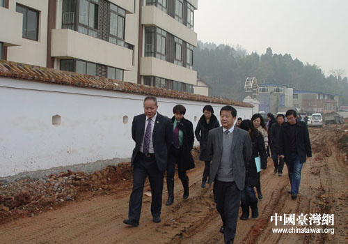 德陽市臺辦主任獨(dú)遠(yuǎn)程(前右1)陪同林郁華協(xié)理(前左1)等來賓參觀即將竣工的新福利院。(德陽市臺辦 甘和林 攝)