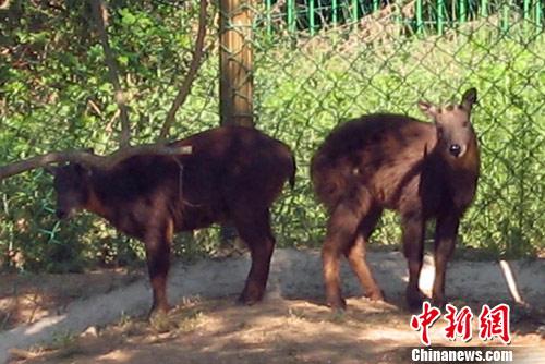 資料圖:5月28日上午,伴隨著威海劉公島上“繁星點點喜樂洋洋”、“相親相愛”的兒童合唱聲,臺灣民眾回贈大陸的梅花鹿和長鬃山羊“繁星點點喜樂洋洋”走出館舍,正式與游客見面。中新社發(fā) 蔡紅文 攝
