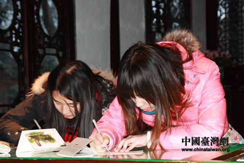 中國臺灣網2月4日蘇州消息 由宋慶齡基金會主辦的“追尋歷史足跡”——城際高鐵之旅活動開始了第三天的行程。今天,來自兩岸的青年學子參觀了杭州靈隱寺飛來峰及中國四大名園之一,蘇州著名的園林拙政園。每到一處,臺灣的同學都會購買當地特色的明信片,蓋上當地著名景點的郵戳。寫滿同學們內心感受的明星片將被寄給他們的父母親朋及大陸的好朋友。真可謂是“小小明信片 郵寄兩岸情”。