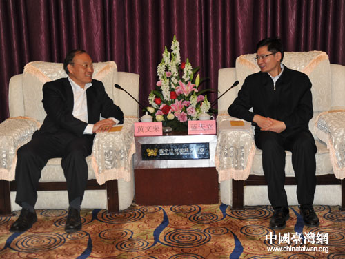 廣西壯族自治區(qū)副主席藍(lán)天立(右)在南寧會(huì)見(jiàn)臺(tái)北世界貿(mào)易中心黃文榮副秘書長(zhǎng)。(圖片來(lái)源:南寧臺(tái)辦)