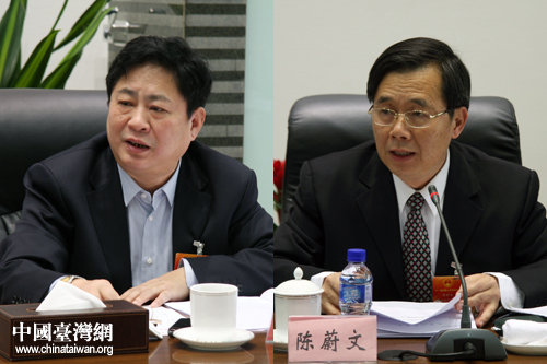 臺籍人大代表陳蔚文(右)和何大欣都將關注的目光鎖定在海峽西岸經濟區(qū)建設上。(中國臺灣網 王偉 攝)